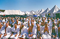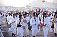 When the sun has risen on the 9th Dhul-Hijjah, proceed towards 'Arafat' in a dignified manner and without harming your fellow pilgrims, at 'Arafat' pray the Dhuhar and Asar prayers, shortened and combined at the time of Dhuhar with one adhan and two iqamahs. Make sure that you are within the boundaries of 'Arafat'. Stay within the boundaries of 'Arafat', except the valley of (Oranah, reciting the praise of Allah the Most High, and offering supplications facing Qiblah with upraised hands. as was the practice of Prophet Muhammad (peace and blessings of Allah be upon him) and remain at 'Arafat' until after sunset. |